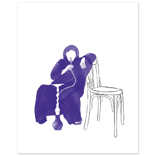 This minimalist illustration features a poignant scene of an old lady enjoying her argeela, beautifully...