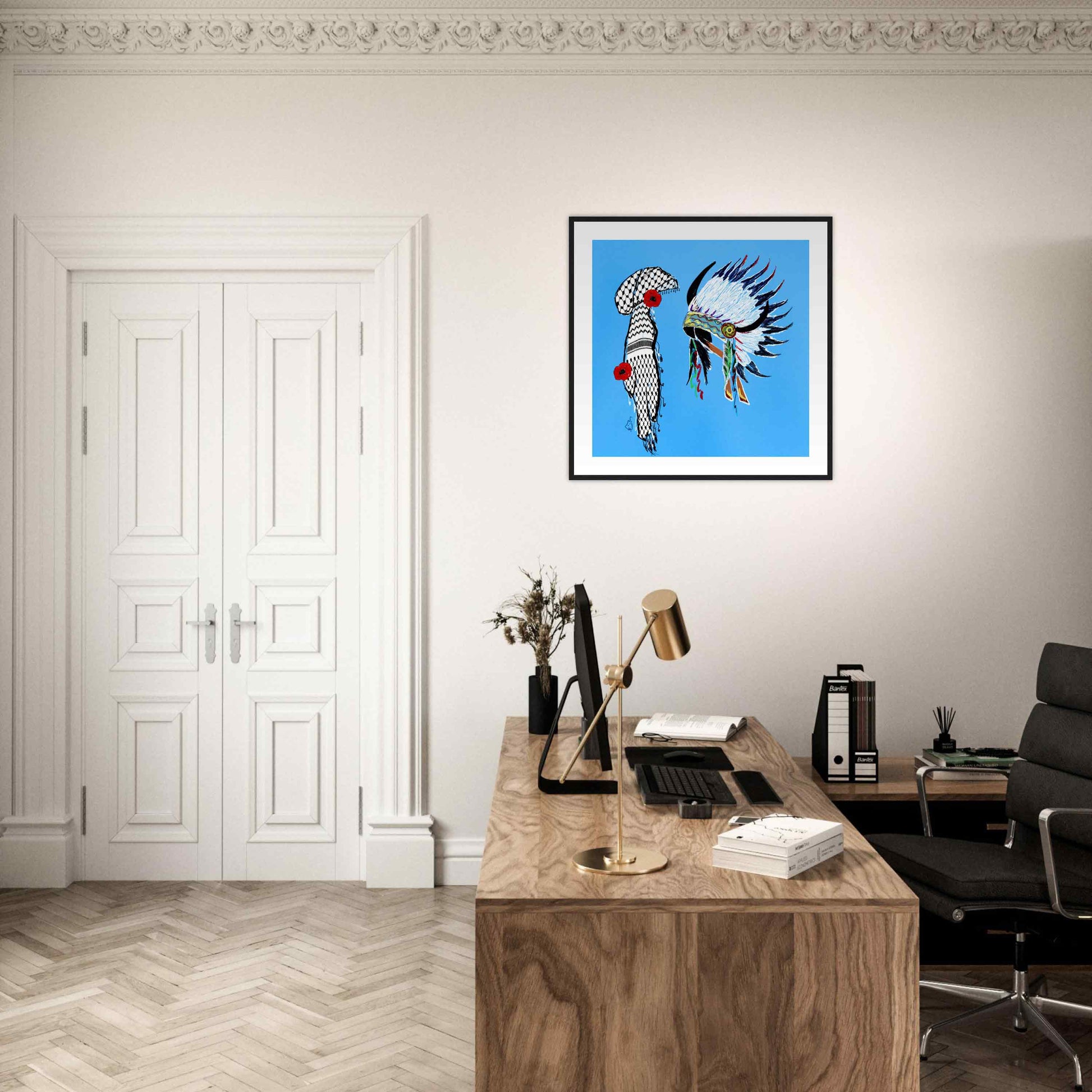 $100Unleash the power of solidarity, where the distinctive kuffiyeh intertwines with indigenous headdresses, symbolizing a united front in support of a free Palestine. This evocative artwork captures the strength and resilience of two communities standing shoulder to shoulder, echoing the call for justice and unity. Bring the spirit of solidarity into your space with this powerful print, a visual testament to the shared struggle and hope for a brighter future.